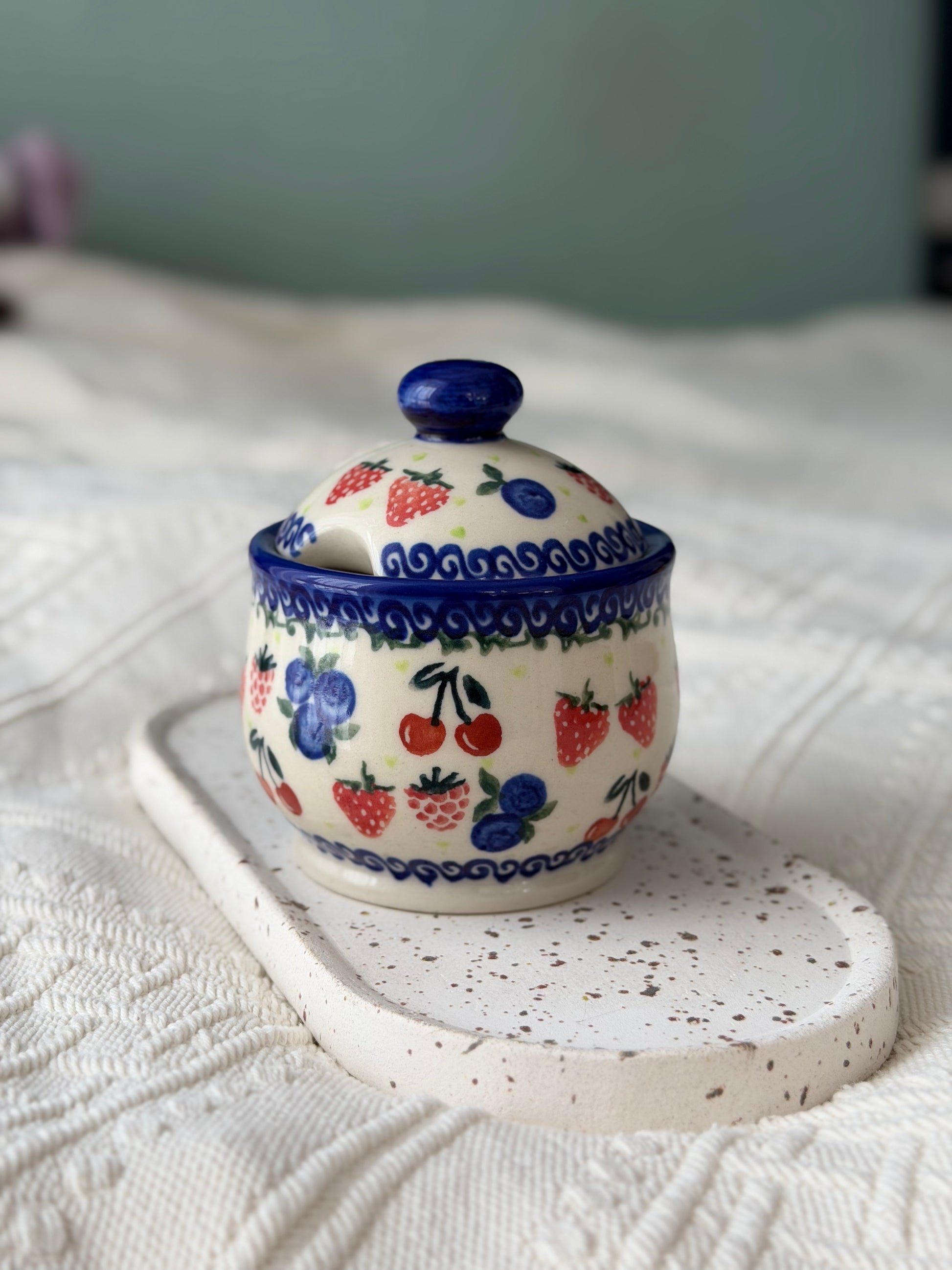 Owocowy wzór z truskawkami, wiśniami i jagodami w połączeniu z klasycznym kobaltowym wykończeniem tworzy radosną, świeżą kompozycję. To ceramika, która ożywia stół - niezależnie od pory roku.