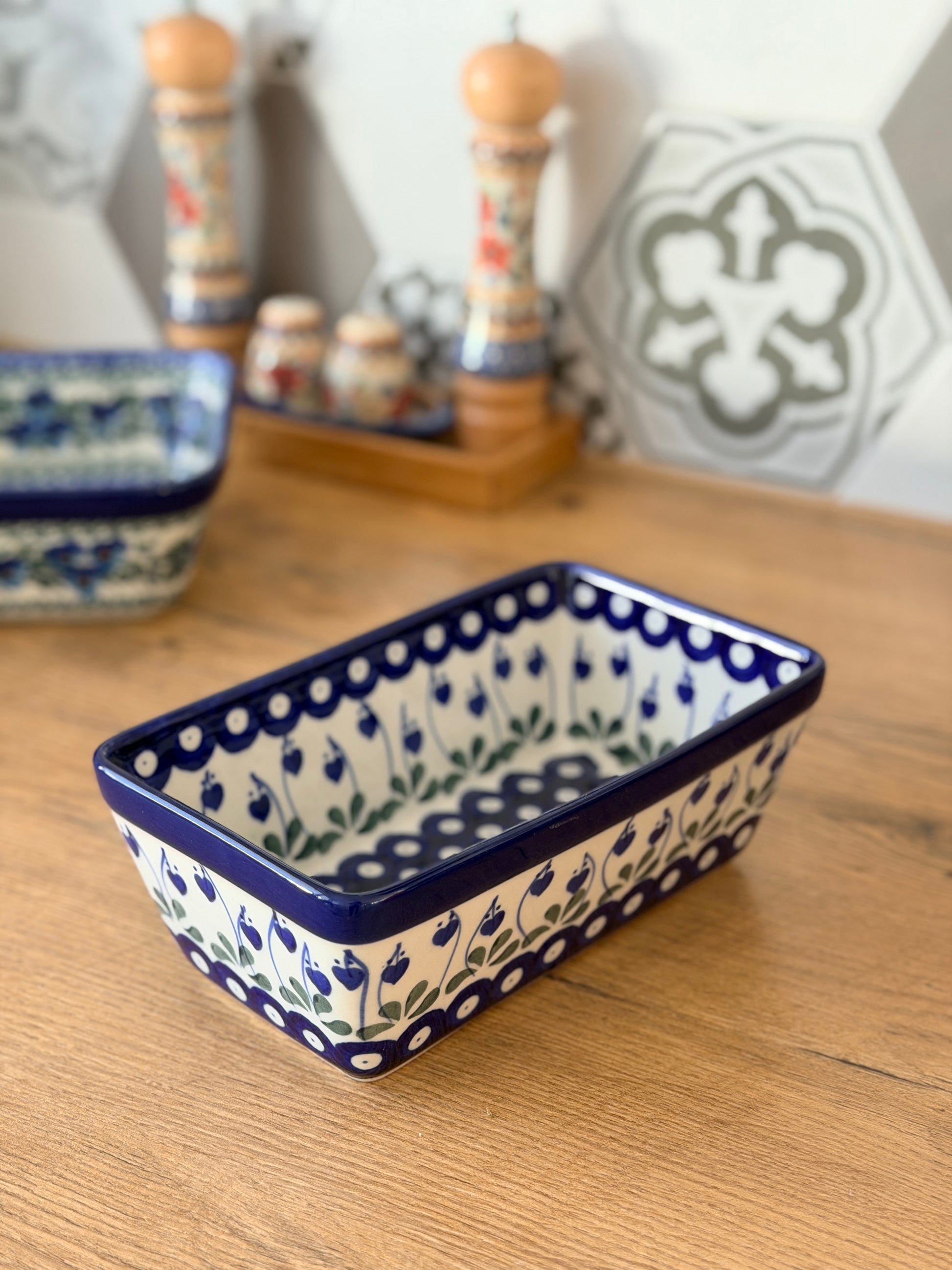 Ręcznie dekorowany wzór w klasycznych bolesławieckich kolorach sprawia, że forma pięknie prezentuje się nie tylko w kuchni, ale również na stole - można w niej podać wypiek bezpośrednio po upieczeniu.