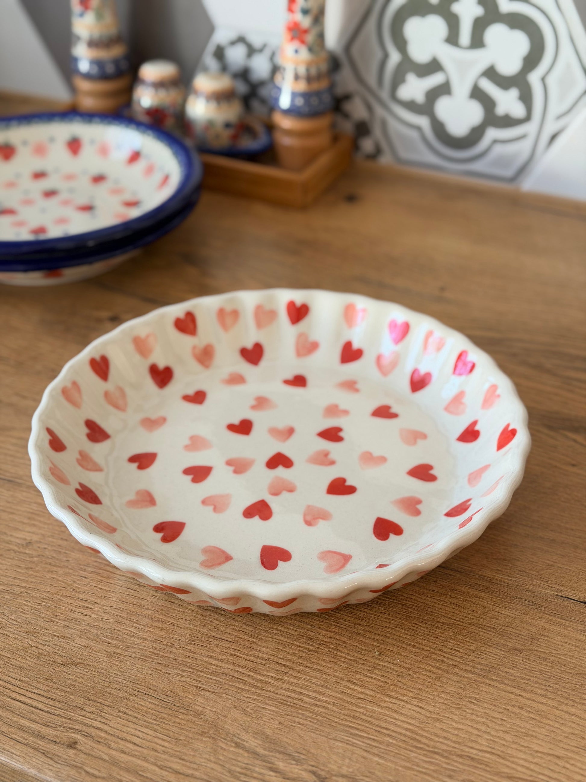 Ręcznie malowany wzór z czerwonymi serduszkami nadaje jej wyjątkowego uroku i sprawia, że forma świetnie prezentuje się także na stole - wypiek można w niej podać bezpośrednio po wyjęciu z piekarnika.