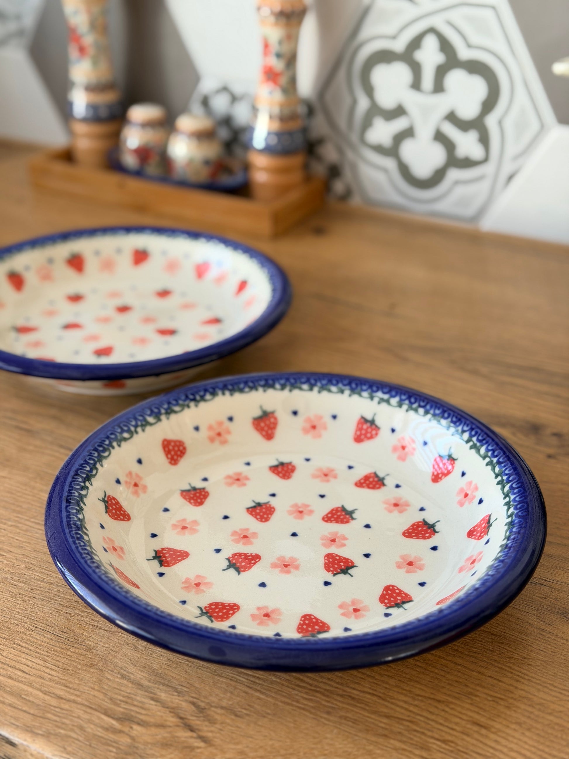 Ręcznie malowany wzór z motywem truskawek i delikatnych kwiatów nadaje mu lekkości i uroku, a klasyczne kobaltowe wykończenie podkreśla charakterystyczny styl ceramiki z Bolesławca.